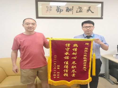 近期,武昌店業(yè)務(wù)部黃孟飛在客訴處理的過程中,熱情耐心,盡職盡責(zé),圓滿的解決了顧客劉女士的訴求。劉女士的老公特贈(zèng)送了一面錦旗,用以表示對(duì)黃孟飛的感謝和對(duì)居然之家售后服務(wù)的認(rèn)可。