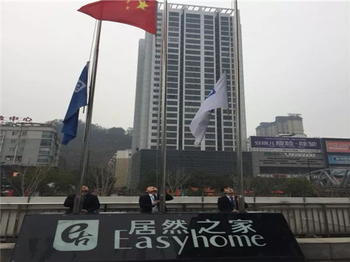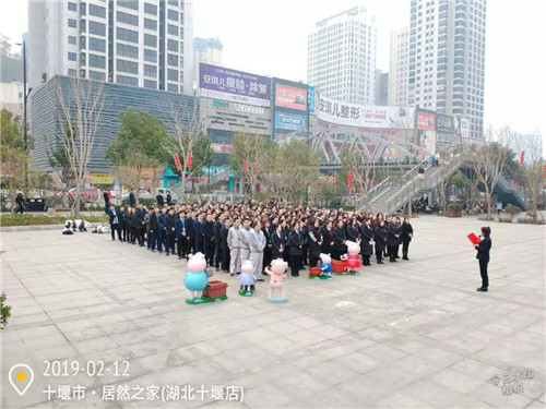 居然之家十堰店全體員工、商戶及銷(xiāo)售顧問(wèn)聚集在六號(hào)廳門(mén)外,舉行新年升國(guó)旗儀式,以飽滿的熱情喜迎“2019年,開(kāi)門(mén)紅”。